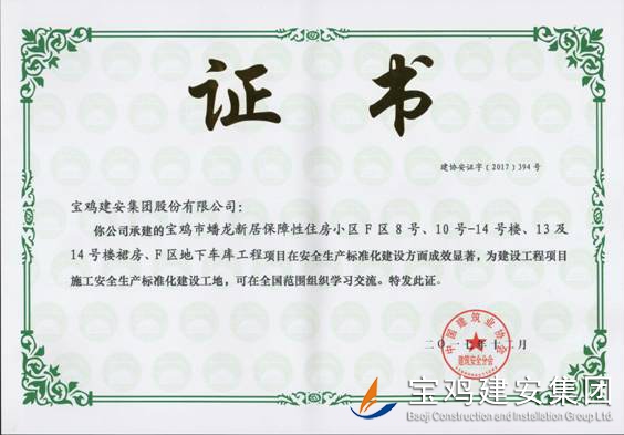 2017年11月23日,從中國建筑業(yè)協(xié)會(huì)建筑安全分會(huì)獲悉,由我公司八項(xiàng)目部承建的寶雞市蟠龍新居保障性住房小區(qū)F區(qū)8號(hào)、10號(hào)—14號(hào)樓、13及14號(hào)樓裙房、F區(qū)地下車庫工程在安全生產(chǎn)標(biāo)準(zhǔn)化建設(shè)方面成效顯著,被評(píng)選為建設(shè)工程項(xiàng)目施工安全生產(chǎn)標(biāo)準(zhǔn)化工地,可在全國范圍內(nèi)組織學(xué)習(xí)交流。這是繼2016年后我公司第二次榮獲此殊榮。我公司連續(xù)兩年獲此榮譽(yù),為進(jìn)一步提高我公司在建筑行業(yè)的影響力,提升企業(yè)形象,促進(jìn)企業(yè)長遠(yuǎn)發(fā)展奠定了一定的品牌基礎(chǔ)。