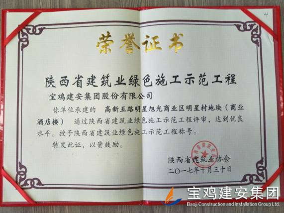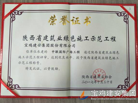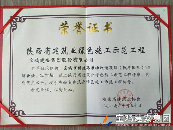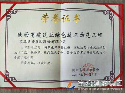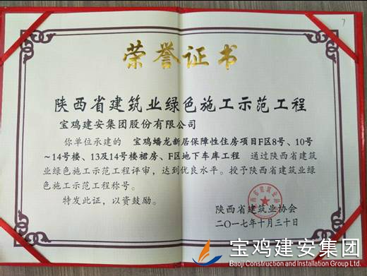 2018年1月26日在西安召開了陜西省建筑業(yè)協(xié)會第六屆二次理事會議,我公司承建的科研生產(chǎn)試驗大樓、寶雞蟠龍新居SF05標段,高新五路明星佳苑、新建路市場改造項目(民豐國際)、中聯(lián)國際廣場項目,在2017年度綠色施工評審過程中,達到優(yōu)良水平,被授予陜西省建筑業(yè)綠色施工示范工程稱號。     此次榮譽的獲得離不開公司各職能部室的指導與項目部的辛勤努力,項目部能緊跟建筑行業(yè)發(fā)展的大方向,不斷加強綠色施工過程管理的學習,在施工過程中圍繞著“四節(jié)一環(huán)?!崩砟?,堅持走節(jié)能降耗,增效降本,可持續(xù)發(fā)展的施工道路,最終取得了可喜的成績。     公司綠色施工整體水平近年來得到顯著提高,希望各項目部在2018年的施工過程中,以文明施工,綠色施工標準嚴格要求自己,力爭在施工管理方面取得更高的成績。