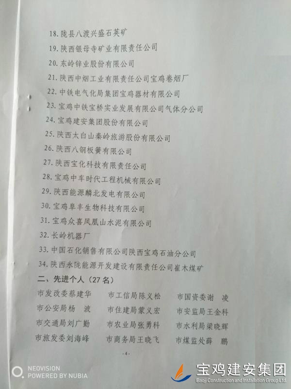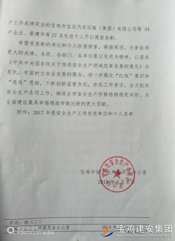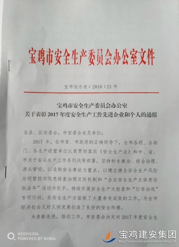 近期,寶雞市安委會對2017年度安全生產(chǎn)先進(jìn)單位進(jìn)行了通報,我單位在考核中以優(yōu)異的成績獲得了此項殊榮。當(dāng)然,取得這樣的成績,離不開各級領(lǐng)導(dǎo)的正確決策和基層單位的艱辛付出,公司安委會在此表示感謝。     2017年,公司始終圍繞在國家的大政方針框架下,積極展開以《安全生產(chǎn)法》及相關(guān)規(guī)范標(biāo)準(zhǔn)為核心的安全工作,堅持標(biāo)本兼治、綜合治理、源頭管控,以遏制安全事故為重點,建立健全安全生產(chǎn)風(fēng)險分級管控與隱患排查治理雙重機(jī)制,持續(xù)開展安全生產(chǎn)專項檢查,杜絕了惡性事故的發(fā)生。在安全生產(chǎn)標(biāo)準(zhǔn)化建設(shè)中,公司始終以“科技創(chuàng)新、合理投入、擇善而從”為出發(fā)點進(jìn)行部署管理,通過系統(tǒng)管理及一系列舉措,使公司安全管理走在本土行業(yè)前列,且在多次檢查驗收中,獲得省、市級領(lǐng)導(dǎo)的點贊。     九牛一毫莫自夸 驕傲自滿必翻車,成績只代表過去,2018年,我們要完善不足,戒驕戒躁,砥礪前行。                                                                   寶雞建安集團(tuán)股份有限公司安委會                                                                           2018年4月25日