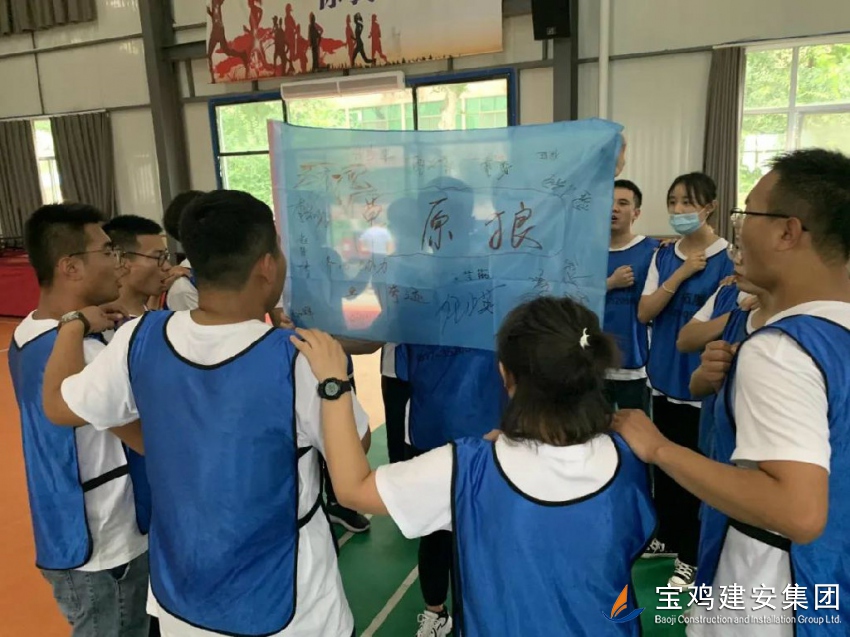 “高空斷橋”項目,它是一項個人挑戰(zhàn)的項目,要求隊員們在8米高的鋼板斷橋單獨通過,斷橋空間跨度大約為1.2米,然后再跳回來就算完成,當(dāng)我踏上鋼板就開始緊張起來,心一直怦怦地跳,但是教練和隊友都能給予我應(yīng)有的幫助和鼓勵。“盲人屋子方陣”項目,需要把大家每個人的眼睛蒙住,分散在開闊的場地上,尋找一條繩子,然后要用這根繩子按點擺成一個屋子的樣子,并要求拿到卡片的隊員根據(jù)卡片的數(shù)字站到相應(yīng)的位置點。這就要要求大家必須聽從隊長一個人的指揮和領(lǐng)導(dǎo),大家齊心協(xié)力,絕對地相信隊長,最后順利完成此次項目。