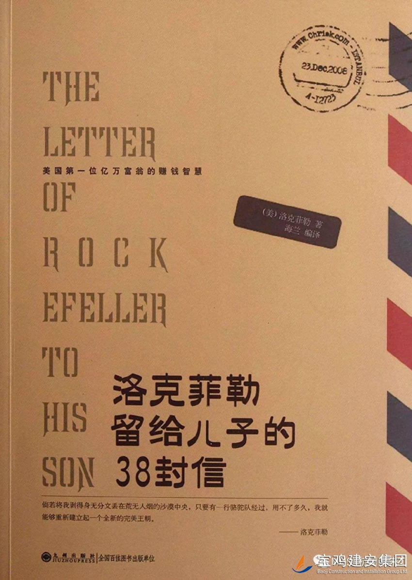 單位:第八項(xiàng)目部  作者:張兆陽(yáng)     中國(guó)有句古話:至樂(lè)莫若讀書,至要莫若教子。如何教育引導(dǎo)好年輕人,長(zhǎng)久以來(lái)都是世界各個(gè)階級(jí)父母所關(guān)注的話題。洛克菲勒,標(biāo)準(zhǔn)石油公司創(chuàng)立者、全球首富。2009年福布斯公布“美國(guó)史上十五大富豪”,洛克菲勒名列榜首。這樣一個(gè)商業(yè)巨擘,同樣也在研究如何指引年輕一代。在這本書中,就淋漓盡致地呈現(xiàn)出了他對(duì)教育的見(jiàn)解。